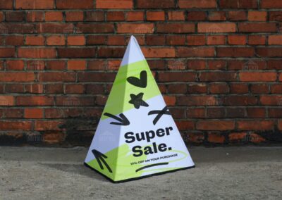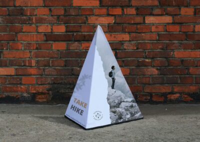 Pyramidi voidaan taittaa molempiin suuntiin. Tämä tarkoittaa, että voit sijoittaa materiaaliin kaksi erilaista kuvaa ja taittaa sen näyttämään erilaisia mainosviestejä tarpeidesi mukaan. Hyödynnä pyramidin alkuperäinen muoto ja sijoita mielenkiintoinen grafiikka kummallekin puolelle! Se voi olla yhtenäinen kokonaisuus tai päinvastoin: seinä, mainosviesti. Kumpi tahansa valitsetkin, suunnittelemme ja valmistamme pyramidin vaatimustesi mukaisesti. Ota se mukaasi jokaiseen tapahtumaan ja esittele brändiäsi missä tahansa!
